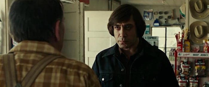 Chigurh squats down and puts the gas station owner’s cock in his mouth. He sucks on it for a few seconds before releasing it.